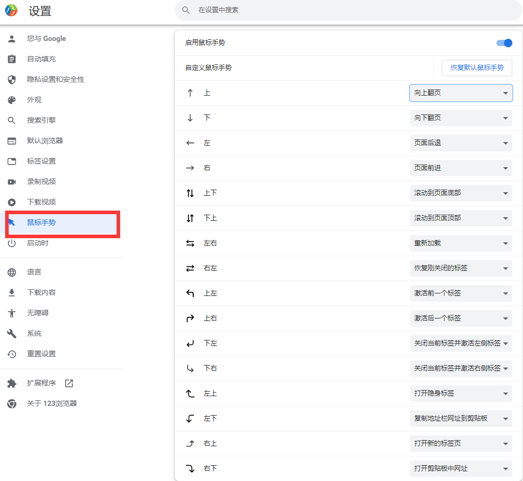 鼠标手势 是123浏览器内置的功能,您可以在 设置->鼠标手势 里面自定义自己的快捷方式 通过完全可自定义的鼠标手势、击键和鼠标快捷键来提高您的工作效率。