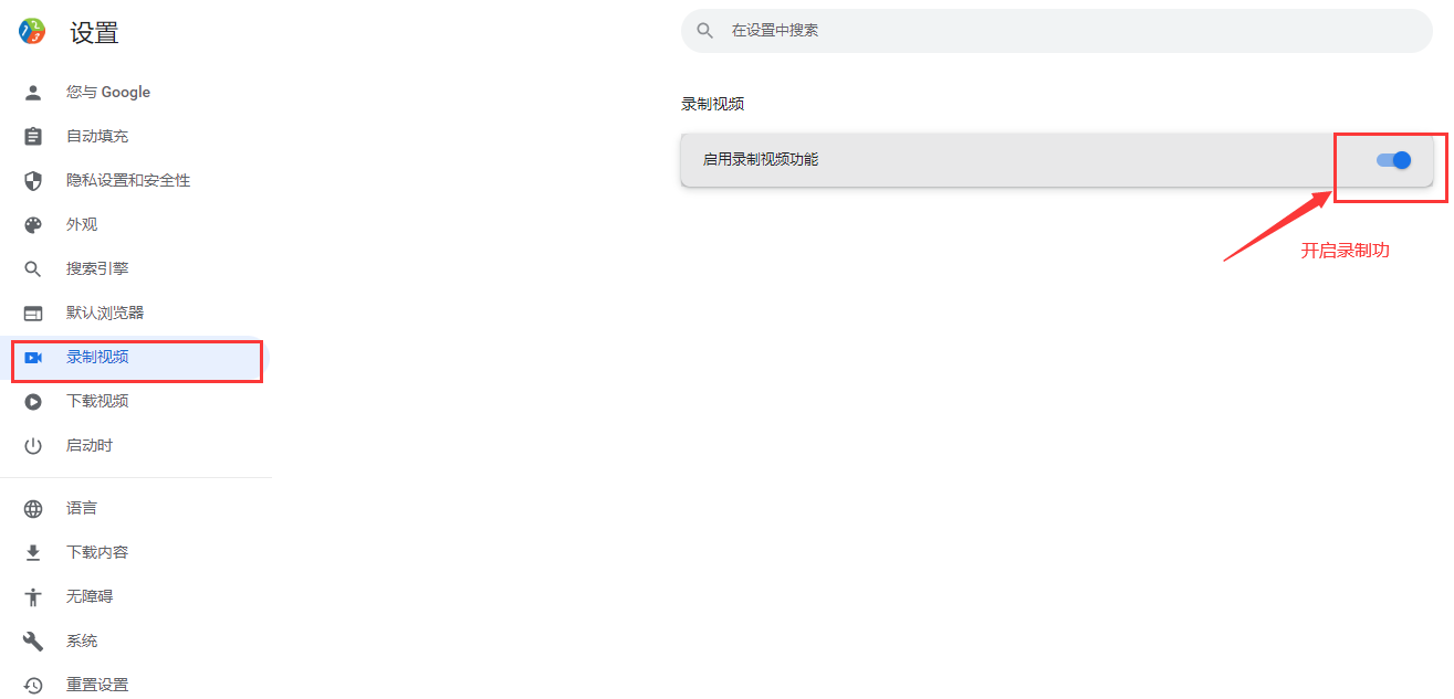 视频录制功能是123浏览器内置的特色功能。打开浏览器设置页面,设置录制功能开关