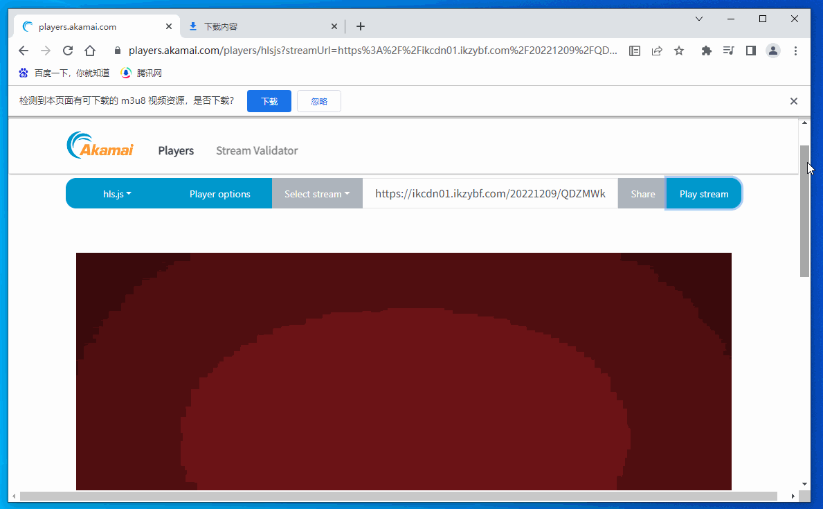 123浏览器可以嗅探到页面上的在线视频 hls m3u8 的视频资源,然后通过信息条提示,方便下载,如下图所示。