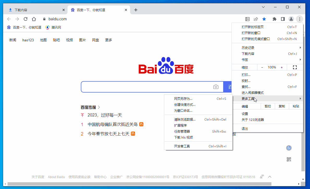 123浏览器可以嗅探到页面上的在线视频 hls m3u8 的视频资源,然后通过信息条提示,方便下载,如下图所示。